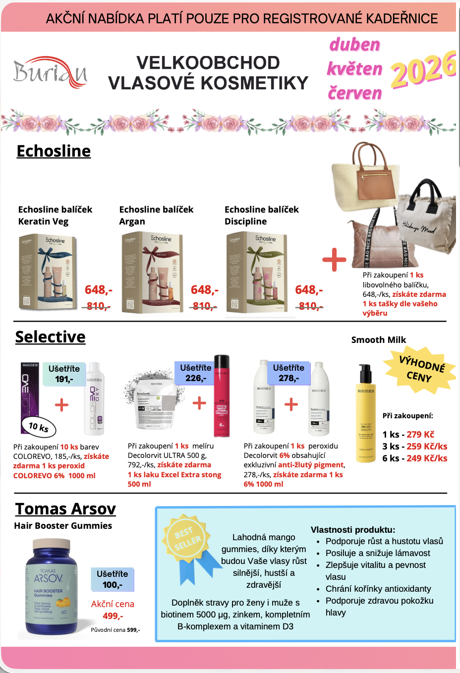 V naší nabídce najdete: profesionální vlasovou kosmetiku - barvy na vlasy, melíry, šampony, balzámy, regenerace, barevná i bezbarvá tužidla, vosky, gely, lesky, krémy na vlasy a další stylingové přípravky na vlasy.